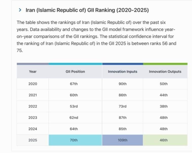 شرایط فعلی بهرهوری در اقتصاد ایران چندان جالب نیست چرا که براساس آمارها ایران در سال ۲۰۲۵ در شاخص نوآوری و بهرهوری رتبه ۷۰ را از میان ۱۳۹ کشور به دست آورده است، براساس آمارها در سالهای اخیر آمار کلی ایران در این شاخص کاهش پیدا کرده است که نشان میدهد ایران در سالهای اخیر در نوآوری و بهرهوری وضعیت جالب و مناسبی نداشته است که بهنظر میرسد سیاست ایران باید در حوزه بهرهوری و نوآوری تغییر کند.